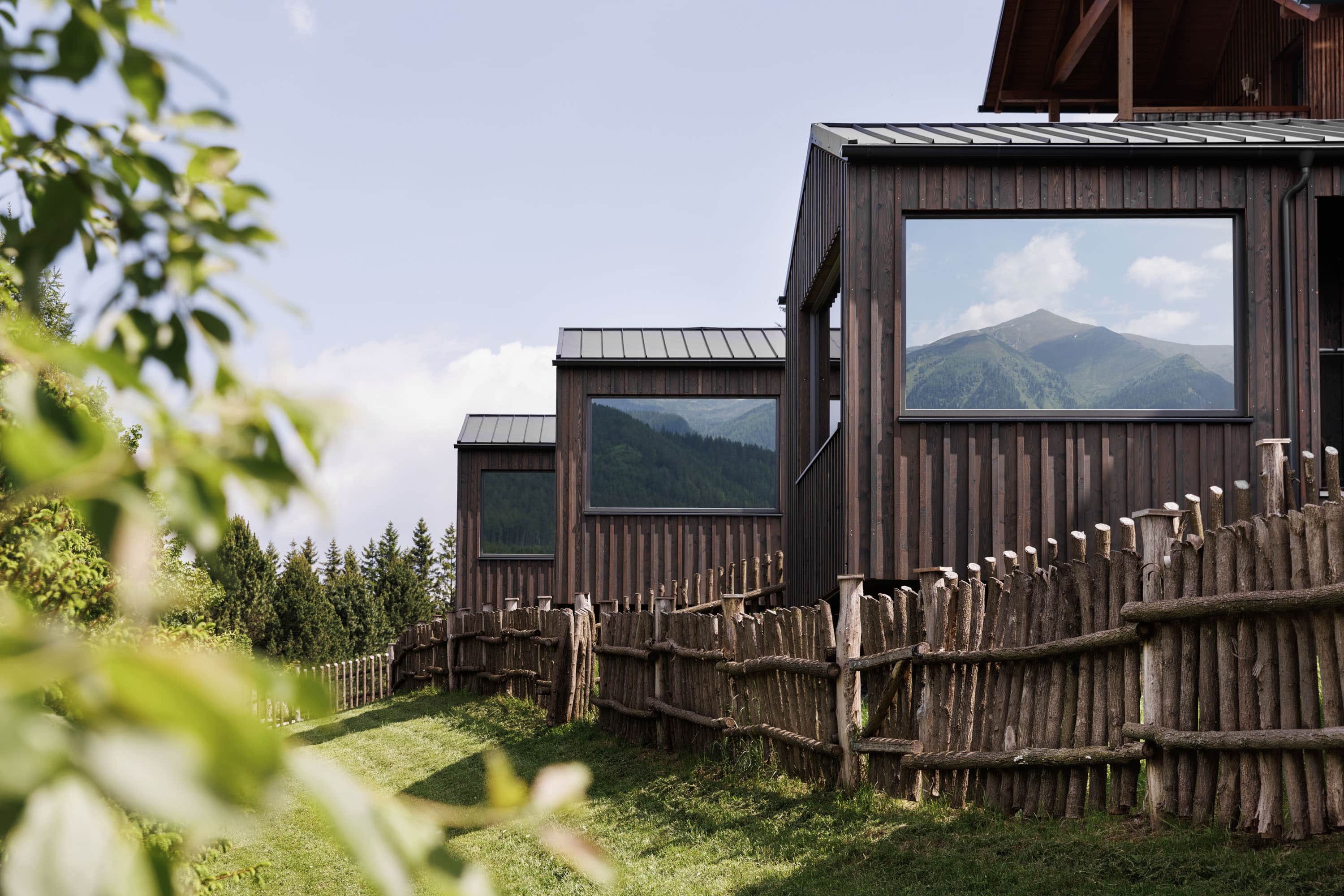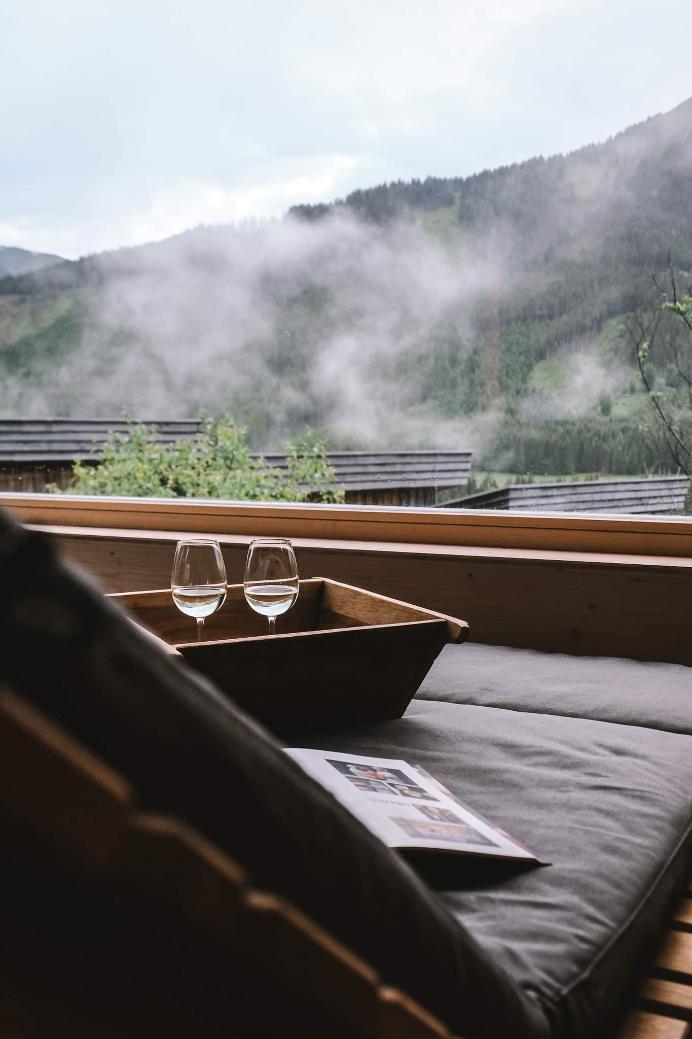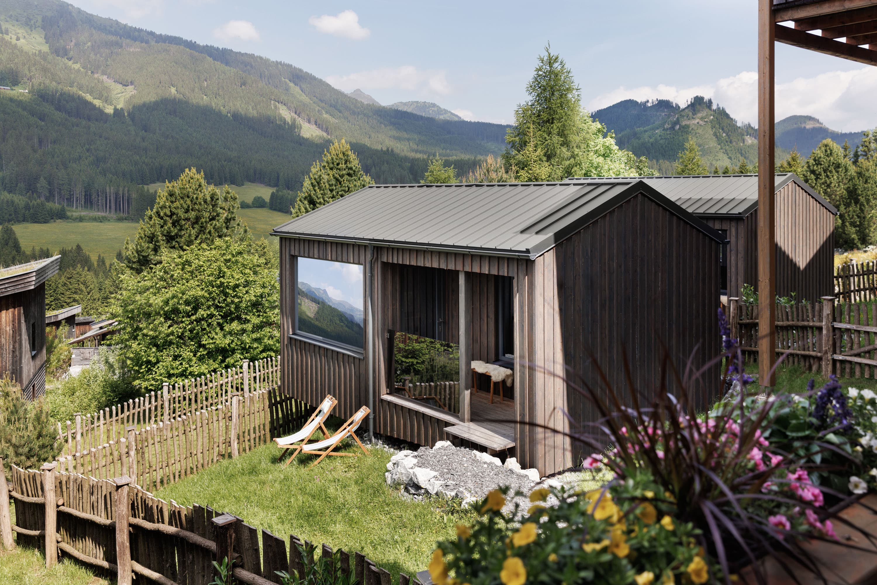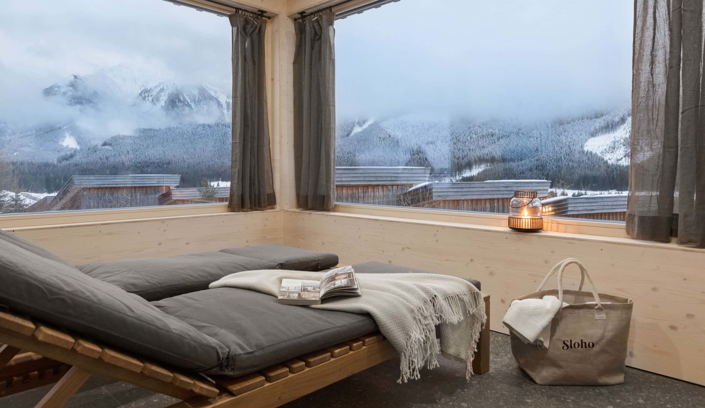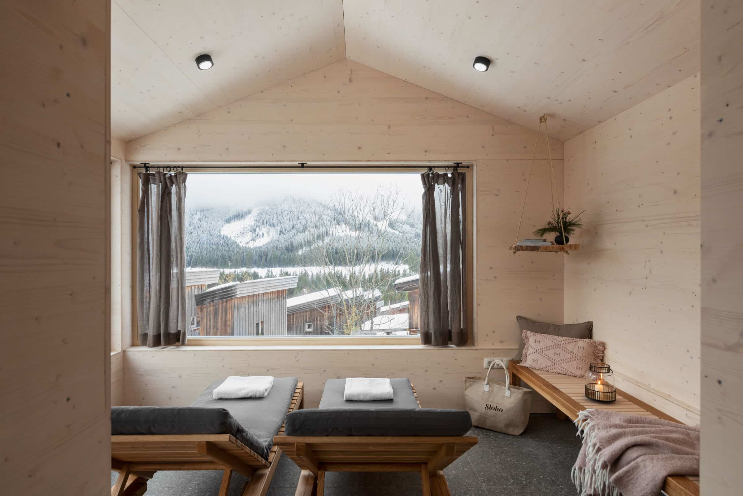 Eine Zirbenholz-Sauna, private Sauna-Häuschen in ausgewählten Appartements, Ruheräume und viel Naturblick.